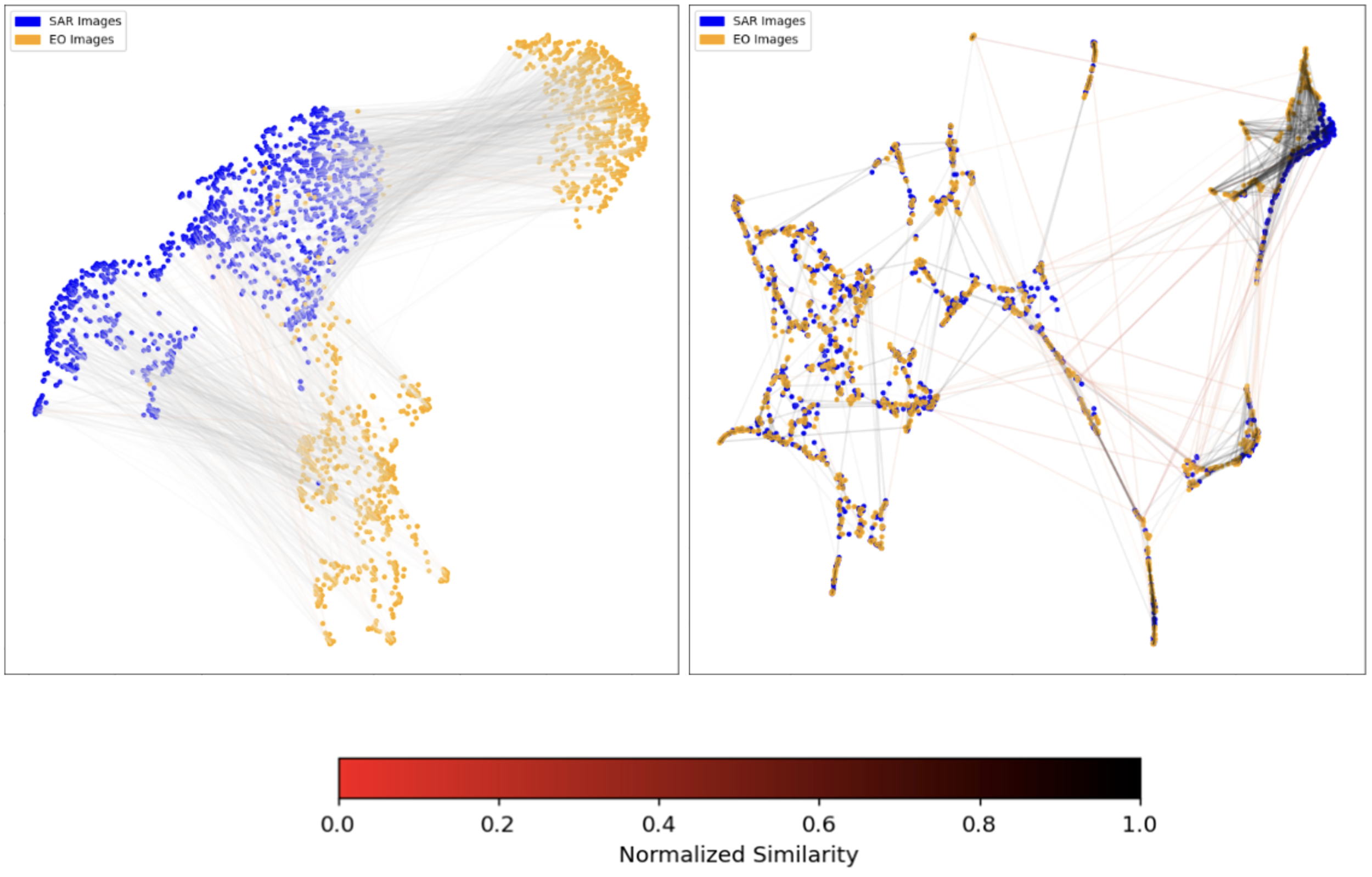 Left: Before Training / Right: After TrainingAs expected, if we pass the images through our models before training via contrastive learning, the embeddings mostly group by their modality type (EO or SAR). After training, the contrastive learning approach teaches the model to pair the images by their scene content rather than their modality. The lines in the image correspond to each matching EO and SAR image pair, after training these lines become extremely small (as the matching pairs are nearly on top of each other), however some outliers still exist. Interestingly, in the top right corner of the second image, a group/cluster of SAR and EO images exist nearby each other. Upon further exploration, the images of these embeddings are scenes of open water, where matching these to a specific image pair would be nearly impossible.