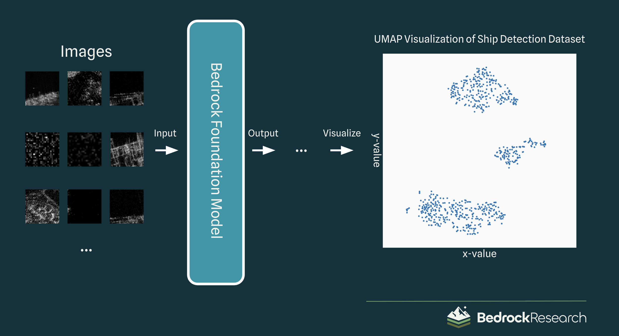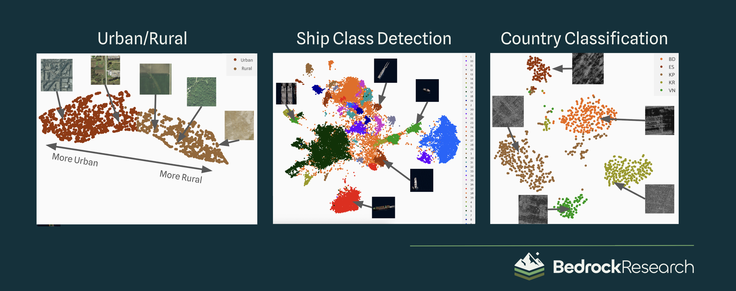 Embeddings on satellite imagery are just as revealing. Plotting the latent space lets us see Bedrock’s vision models move from basic concepts—urban vs. rural—to harder tasks—classifying ship types—to very advanced inference—estimating country of origin from urban patterns in Synthetic Aperture Radar (SAR) imagery.