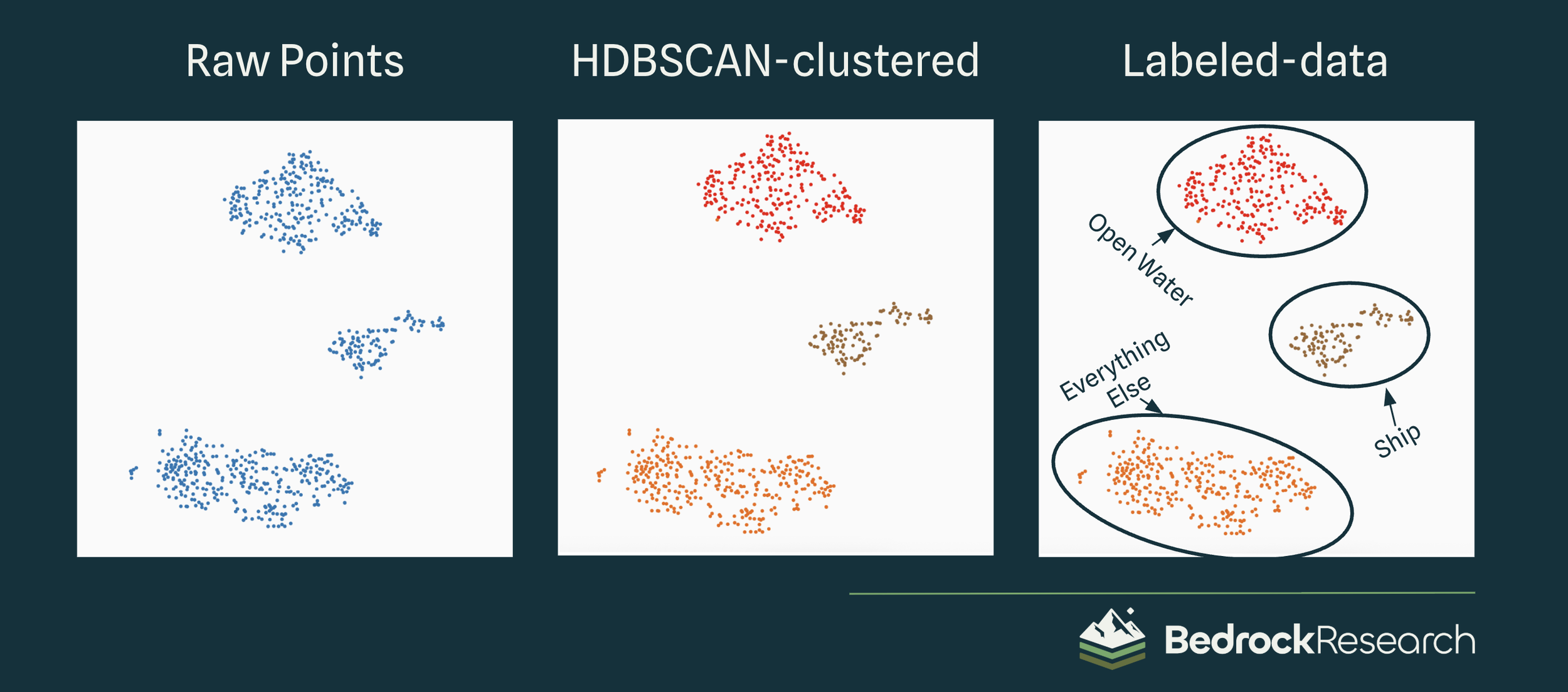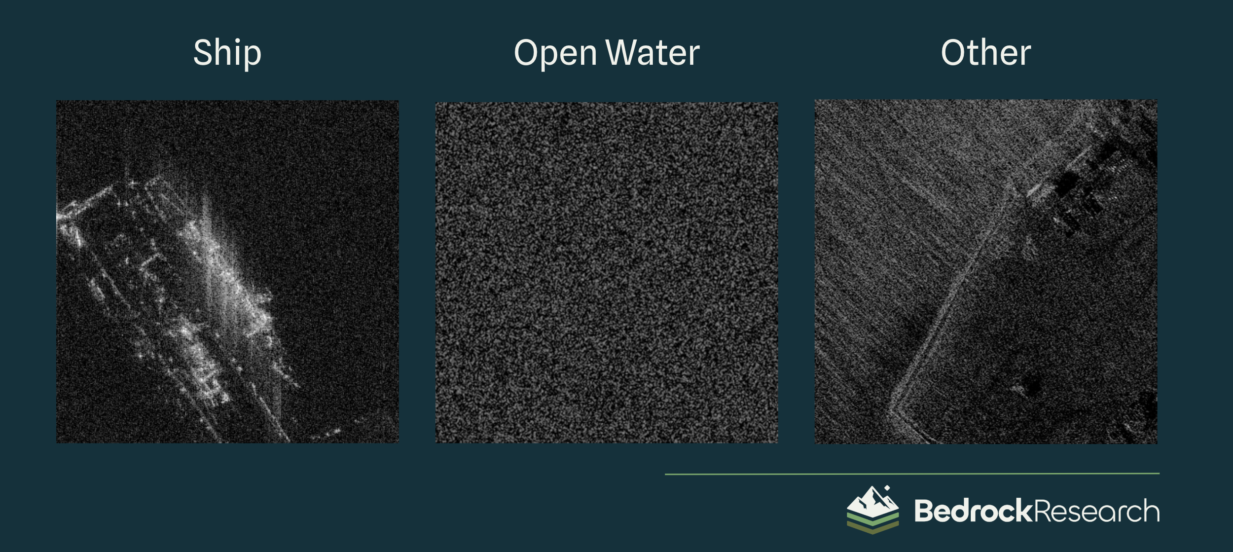 Using a cluster-recognition algorithm like HDBSCAN, automatically assign each image to a certain group. Then, give each group a semantic label like “Ship,” “Open Water,” and “Other.”